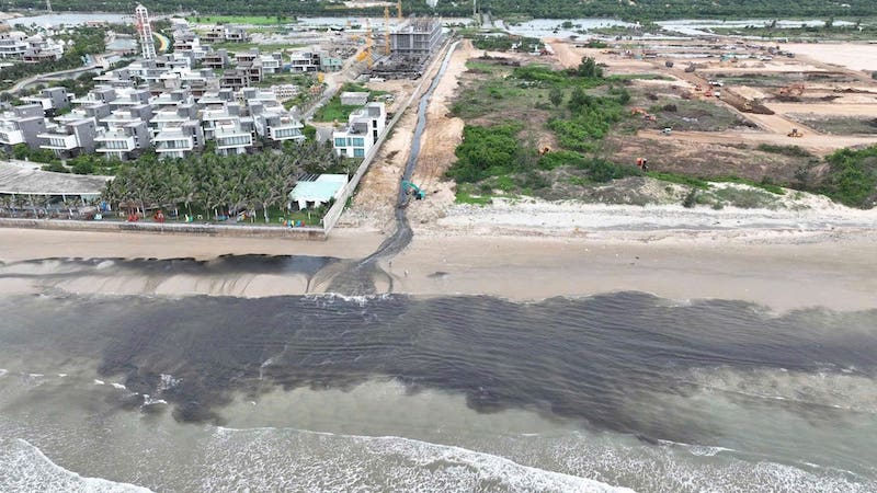 Cụ thể, trong quá trình thi công, chủ đầu tư đã cho người đào mương khiến nước trong dự án thoát ra bãi biển. Nhìn hình ảnh từ trên cao, một khu vực biển nơi nước thoát ra bị đổi sang màu đen, việc này khiến nhiều người lo ngại ô nhiễm môi trường biển.